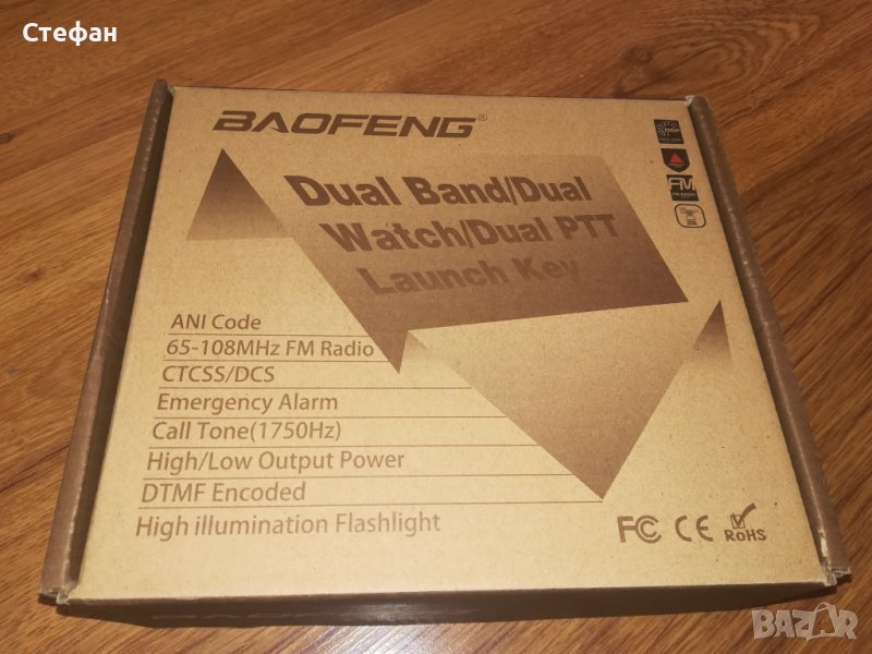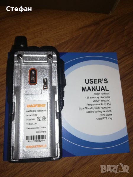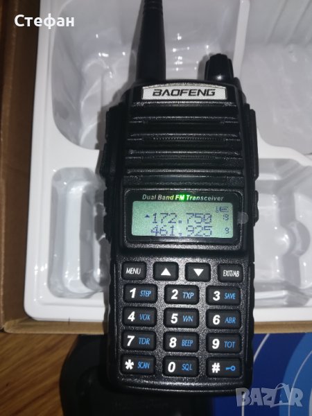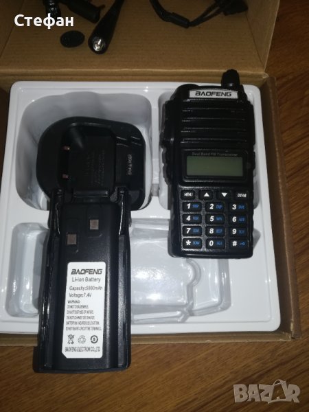 Радиостанция Баофенг Baofeng - UV82, чисто нова, перфектна, с възможност за допълнителна малка антена, с която работи много добре и не пречи за закачане по джобовете, малката антена се продава отделно на цена от 10лв/5,11eur/бр. Цената на окомплектованата радиостанция е 70лв/35,79eur/бр.