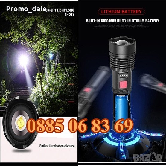 Мощен LED презареждащ се фенер с много здраво тяло от алуминиева сплав и дизайн против приплъзване. Дисплей за капацитета на батерията, телескопично увеличение.