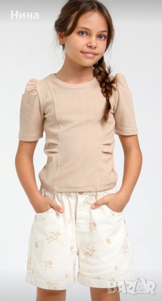 Блуза с къс ръкав, от рипс мека материя, в цвят Nude, с лек набор от двете страни и леко бухнали ръкави 🔝 Налични размери: 140 см, 152 см, 158 см и 164 см 🛍️