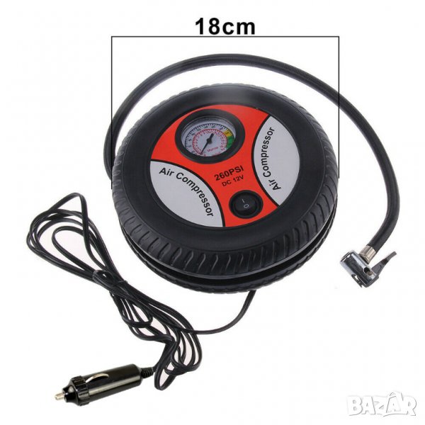Автомобилен компресор под формата на гума с диаметър само 18 сантиметра. С включените накрайници може да напомпите не само гумите на вашия автомобил, а и надуваем дюшек, топка, гуми на велосипед и др. Захранва се от запалка в автомобил - 12V