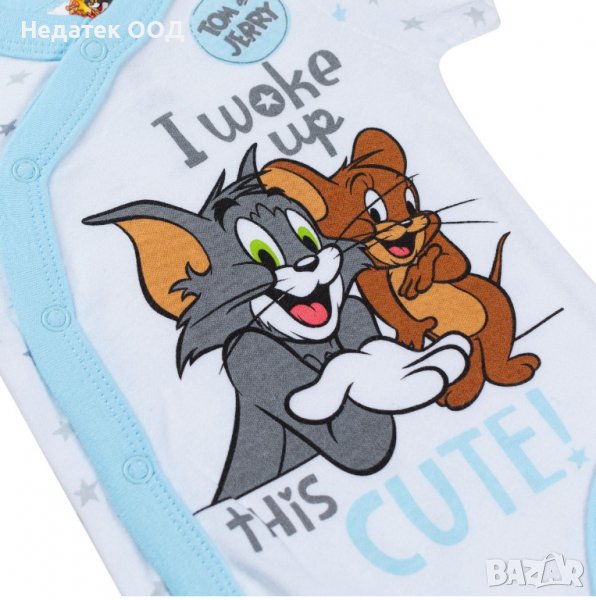 Памучно боди за момче Tom & Jerry I Wake Up с къс ръкав и странично закопчаване.