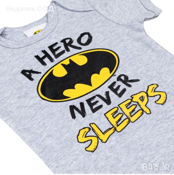 Бебешко боди за момче в цвят сив меланж с къси ръкави, закопчаване в долната част и щампа batman a hero never sleeps.