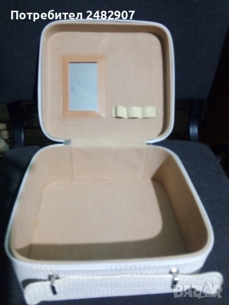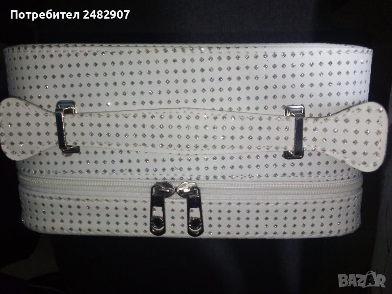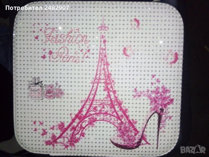 Стилно козметично кожено куфарче в бяло и розово, с красив и изискан френски дизайн и блестящ ефект. Много удобно и практично, най-вече при пътуване. Размери - 23,5/21,5 см, височина - 11 см. Закопчава се с цип и има удобна дръжка в горната част. Идеално, както за подарък, така и за да побере Вашата козметика за ежедневна употреба. Чисто ново, не е използвано.