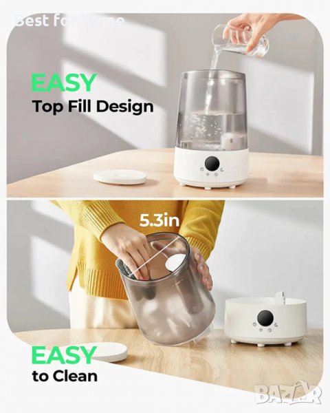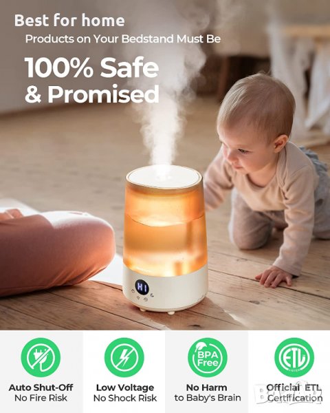 【100% сертифицирана безопасност】Сертифициран по всички световни стандарти ETL, FCC, CE и UKCA, овлажнителят осигурява на всичките ви семейства овлажняване без риск и BPA. А технологията за автоматично изключване премахва всички рискове от работа на сухо или пожар. Дори и за бебета е перфектно!