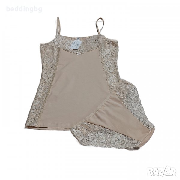 Дамски дизайнерски комплект в цвят - Бежов. Състои се от две части - корсаж с тънка презрамка, леко втален и богато декориран с мека еластична дантела в горната и страничната част. Бикините са със стандартна талия, украсени с дантела. Комплектът е изработен от нежна памучна материя, която придава пълен комфорт.