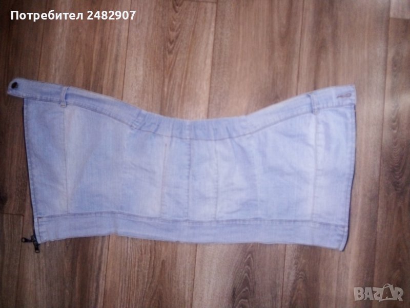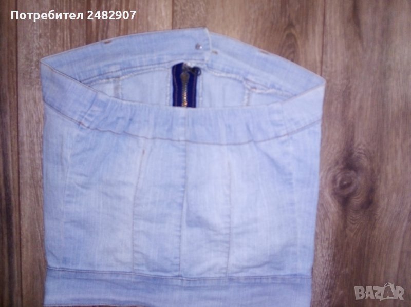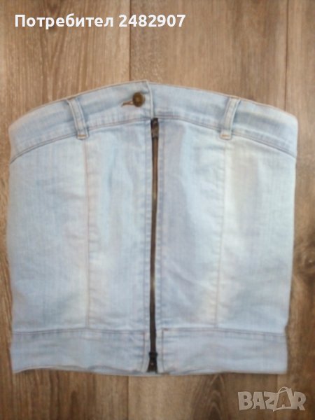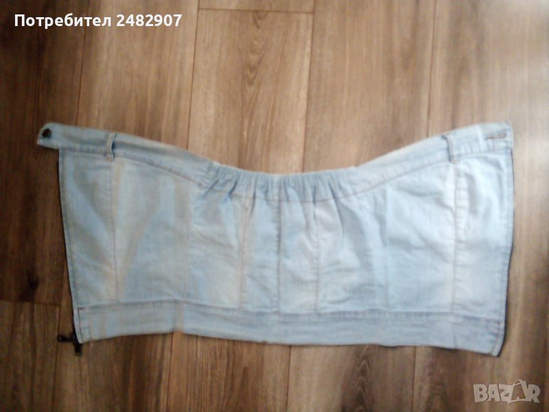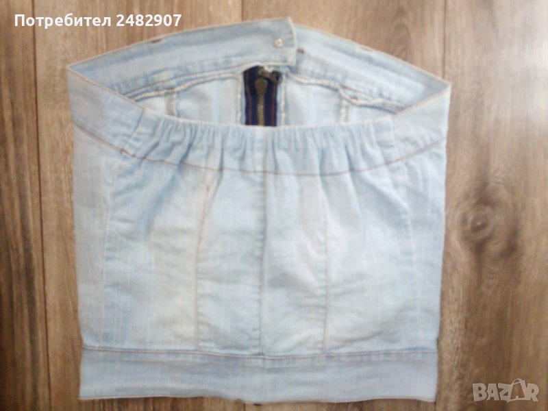 Дамско дънково бюстие в светло синьо, размер 38, ширина под мишниците - 36 см, ширина в долната част - 35 см, дължина от под мишниците до долу - 31 см. Съдържа 97 % памук и 3 % еластан. Има ластик в горната част на гърба, много запазено, почти не е използвано.