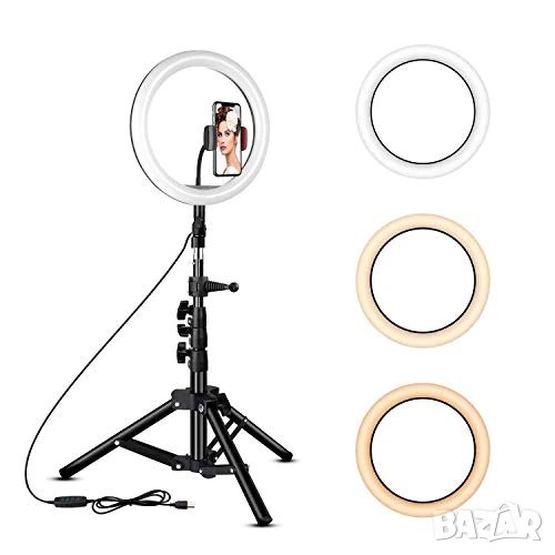 LED лампа-ринг за заснемане на видео или фото в комбинация със стойка за телефон, тази лампа като осветяване