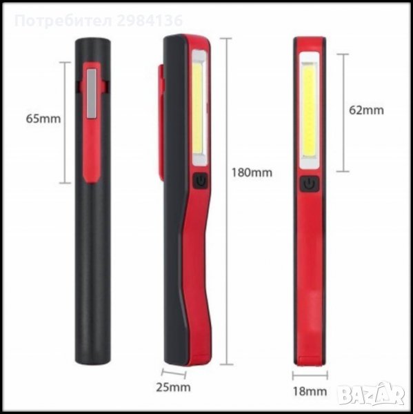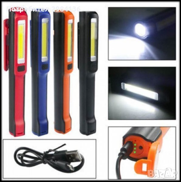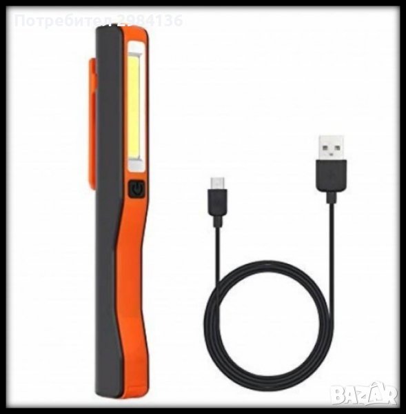 Малък и лек осветителен инструмент за работа в тъмни и труднодостъпни места. LED фенер за по-далечни дистанции и COB лента за локално осветление. Лек и здрав корпус от ABS пластмаса за да не бъде досадно за носене. Въртящ се клипс на 180° за закрепване на колан, джоб. Магнит за закрепване на метални повърхности. Вградена презареждаема батерия. Зарежда се с microUSB порт от всяко USB устройство или зарядно за GSM. Комбиниран бутон чрез изреждане: LED фенер => COBfener => OFF. С размери малко по-големи от нормална писалка, изключително удобен инструмент за автомонтьори, инспектори, охранители, ремонтни работници, рибари и други. В комплекта: фенер, USB кабел за зареждане, кутия.