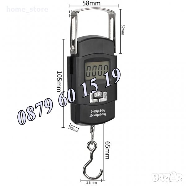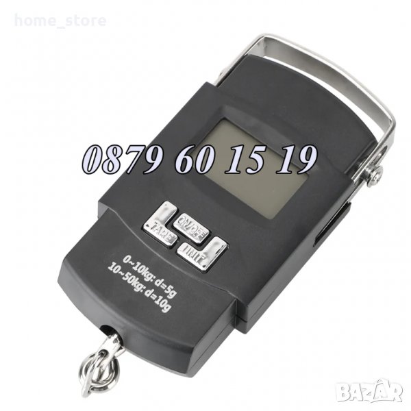 Ръчно електронно кантарче за мерене теглото на багажи с метална кука и дръжка.