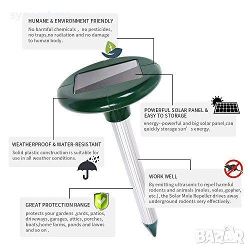 1. Репелерите трябва да се поставят там, където слънчевата клетка получава максимална слънчева светлина; 2. Оставете основата на главата 1"-2" над земята; 3. Препоръчваме инсталиране на слънчевите репелери за къртици и др. вредители на всеки 20 метра за терени, посещавани от гризачи; 4. Характерът и плътността на земята влияят на работата на репелера, така че преди да го инсталирате, проверете земята. Твърдата земя позволява най-доброто предаване на звука. Земя, която е замръзнала, напоявана или подгизнала, не е подходяща; Започнете, като поставите един или повече репеленти за вредители срещу мястото, където искате да изведете от почвата вредителя. Препоръчваме да започнете близо до стената на къщата. Лесен и удобен за използване. Безопасен и без химикали. Изработен от здрава ABS пластмаса и устойчив на корозия алуминий. Захранва се със слънчева енергия и няма нужда от допълнителна батерия. Водоустойчив, без притеснения за екстремни метеорологични условия. Без вреда за вашия домашен любимец. Не оказват отрицателно въздействие върху човека. Спецификации Ефективно покритие: 650m? Честота: 400-1000Hz