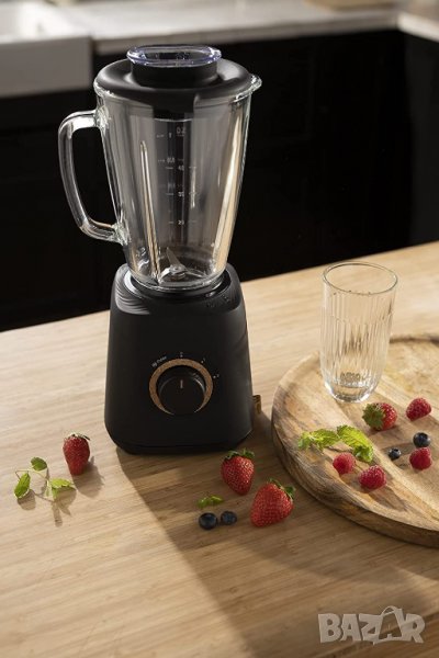 - Топлоустойчива стъклена кана до 80 °C и с голям капацитет (общо 1.75L / 1.25L полезно) както за топли, така и за студени приготовления