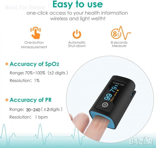 Пулсовият оксиметър на върха на пръста се побира лесно в един джоб, което го прави чудесен продукт за домашна употреба, както и за здравни заведения.