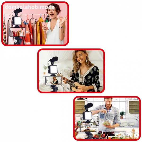 Комплект за видеоблог със статив, LED лампа, микрофон и стойка за мобилен телефон