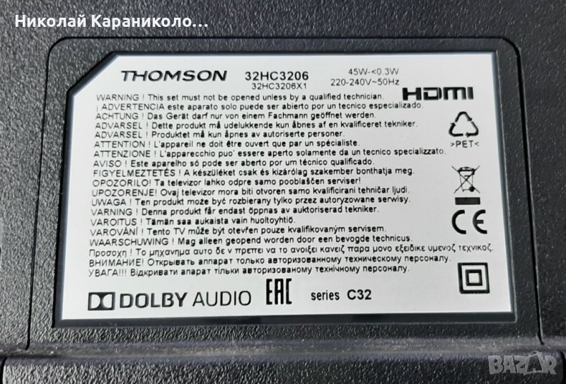Продавам тв. THOMSON 32HC3206 за части по причина-дефектирала матрица/LVW320D1L/.Редовни съответно: