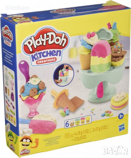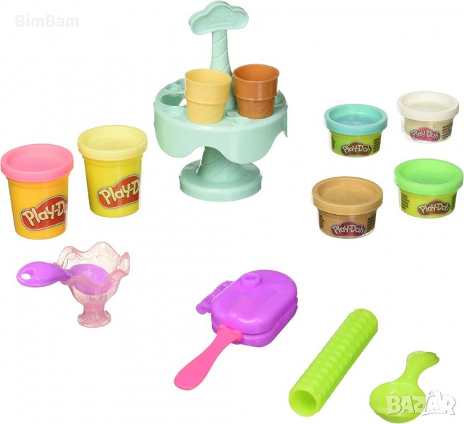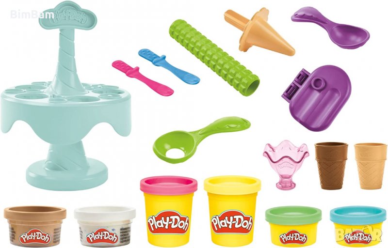 - играчка-въртележка за сладолед, форми и пръчици за сладолед, фунийки, лъжица за сладолед, чаена лъжичка, сладоледена десертна чиния за сладолед, ролка за вафли, 6 кутии смес Play-Doh в ярки цветове: бяло, розово, синьо, зелено, жълто и кафяво (белите и кафяви кутии смес са специални смеси за конфети),