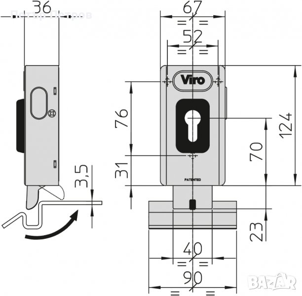 Включва подова капачка за езика на бравата и единичен цилиндър от европейски профил тип VIRO 975, чрез който отключваме бравата с ключ. Достъпът е разрешен само от страната, където е монтирана бравата.