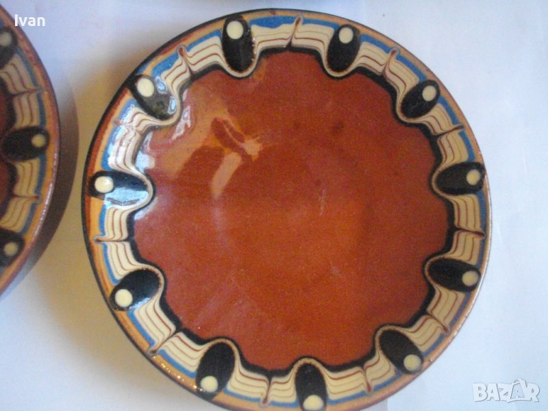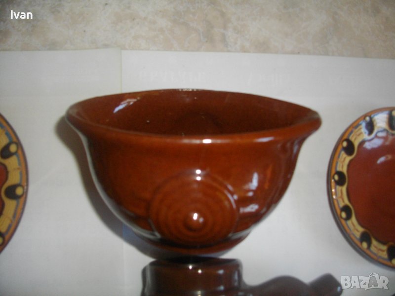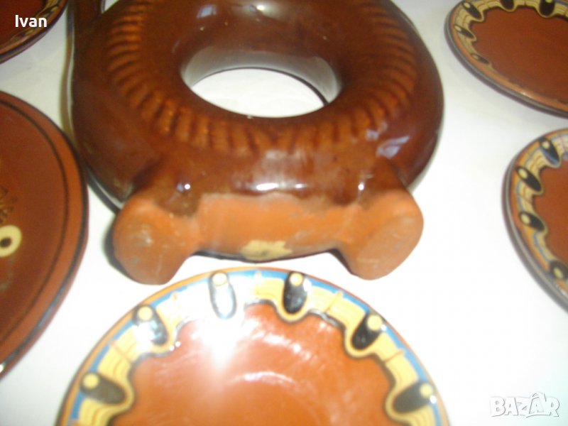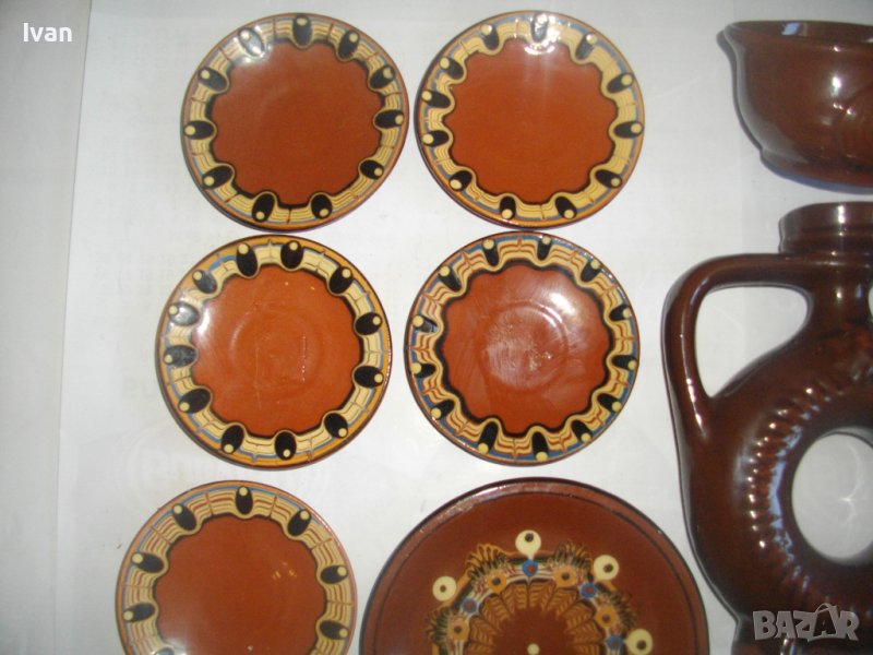 Съдовете и чиниите са от печена глина с глазура, ръчно рисувани под глазурата - цветовете са устойчиви и не се изтриват при тертиране с препарати.