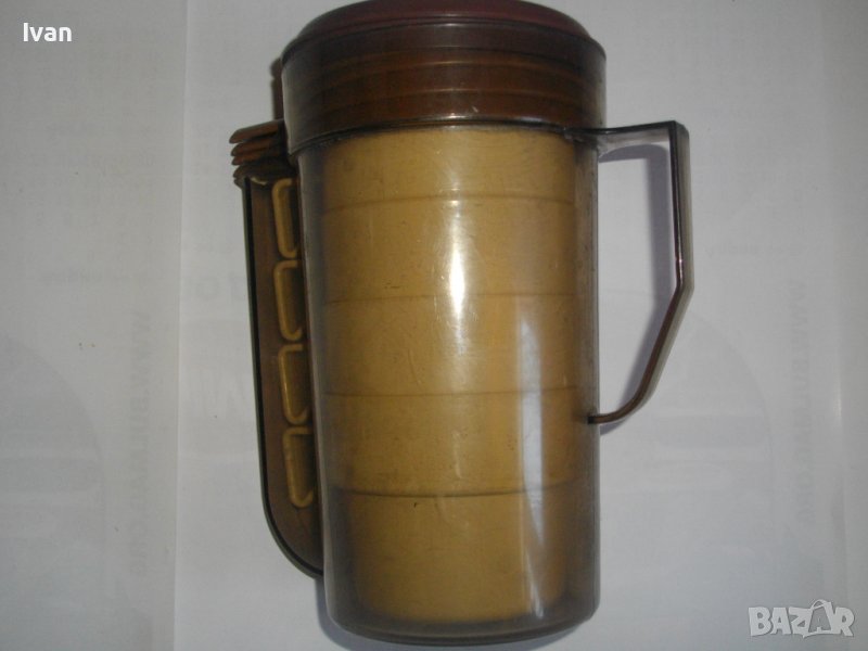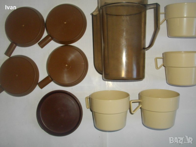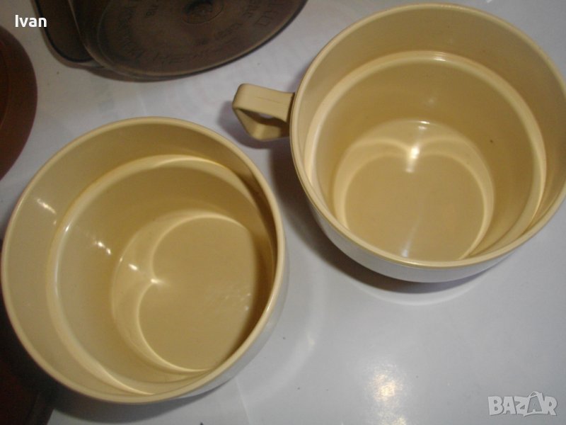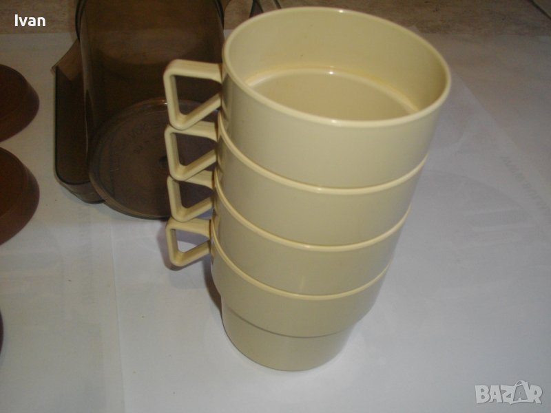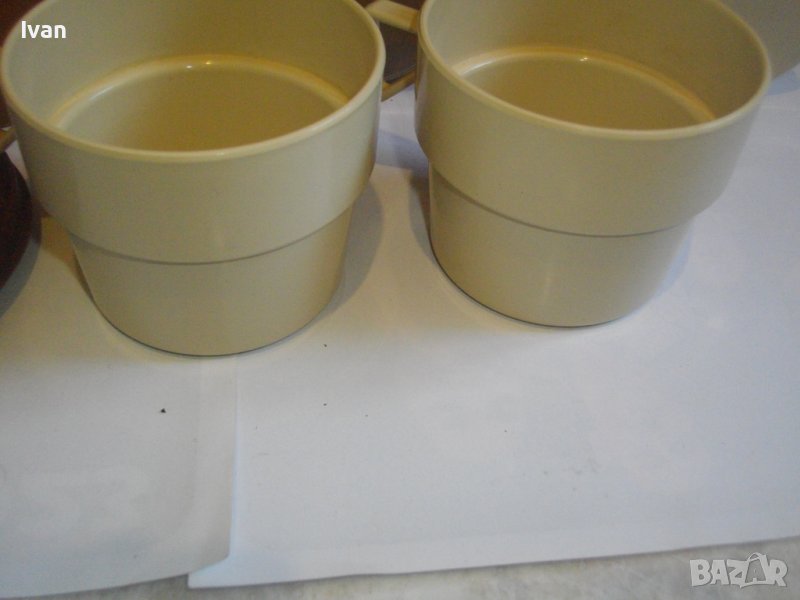 Чашите са твърда трудночуплива пластмаса, цвят бежав. Вместимост на чашите - около 200 мл.