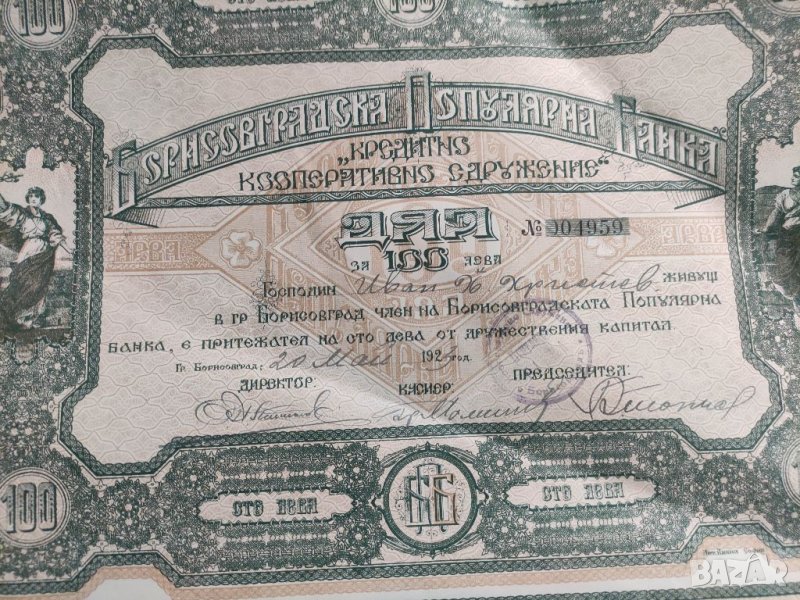 Продавам акция 100 лева Борисовградска популярна банка → Обява 39666862