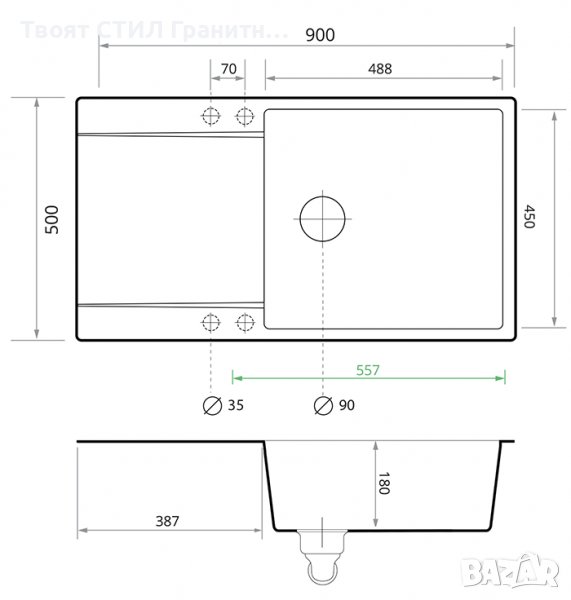 Зелената линия показва необходимото пространство в мм за монтаж на мивката в шкафа !!!