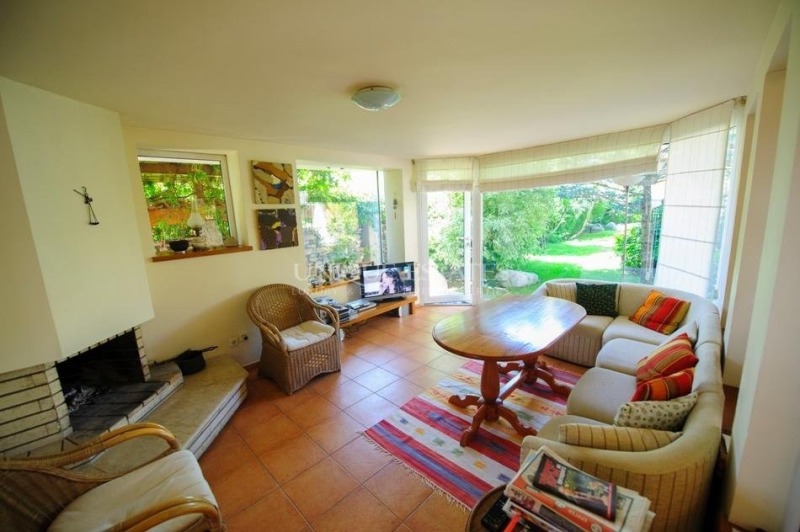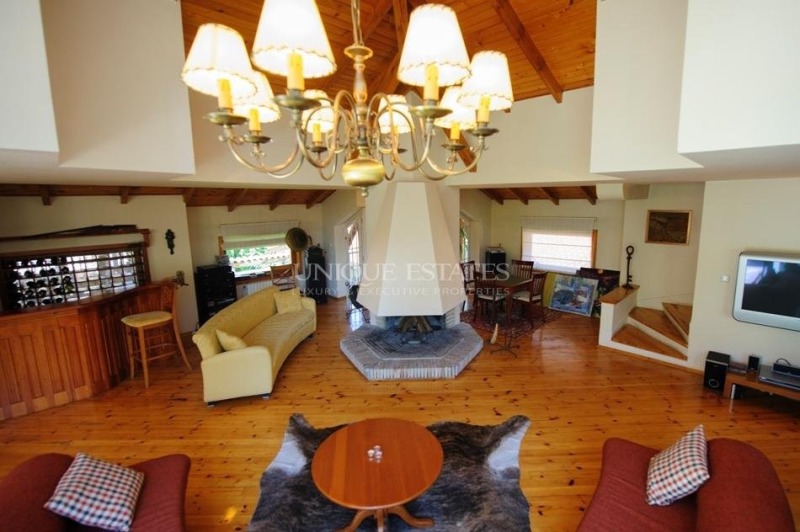 Първо ниво: Просторна дневна зона с голяма кръгла камина, трапезария и кухня, малка допълнителна дневна с камина и санитарен възел. Големи витрини осигуряват прекрасен изглед към градината.