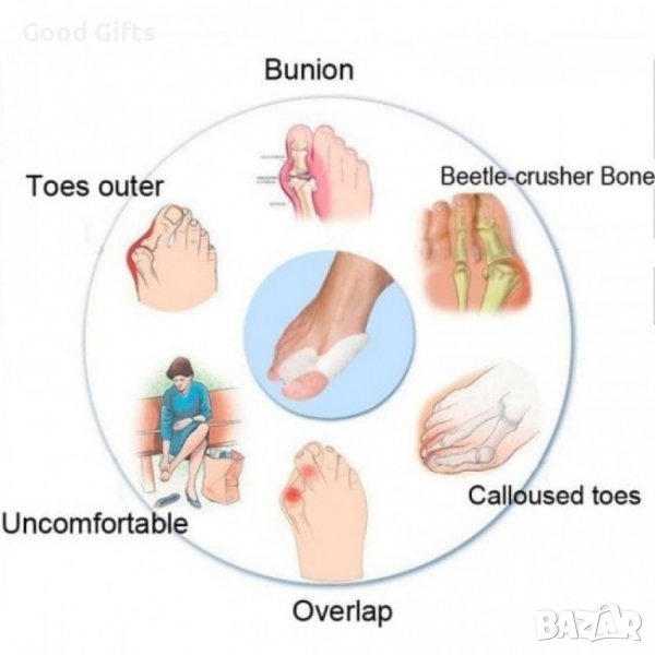 Представяме Ви средство № 1 за премахване на деформацията на палеца - силиконовия разделител за кокалче на крака. Този силиконов разделител за пръсти ще Ви предпази от неудобство при носенето на обувки - протърквания на кожата и появата на рани, мехури и мазоли, от изкривени палци на краката, при застъпване на пръстите на краката, от тежко изкривяване настраничната кост на крака. Ако имате някои от тези състояния можете да бъдете сигурни, че този силиконов разделител за пръсти ще Ви помогне.