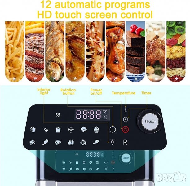 [12 режима] може да избира да пържи, пече, печени зеленчуци, свински ребра, царевица на кочани, кексчета, препечен хляб, пица, пържени картофи, пържола, риба, скариди, претопляне, пилешки крилца, пилешки бутчета. Благодарение на системата за циркулация на горещ въздух и уникалната комбинация от перфектна температура и време ви позволява да готвите храната равномерно и нежно, така че външната повърхност е хрупкава, а вътрешният слой е сочен и нежен.