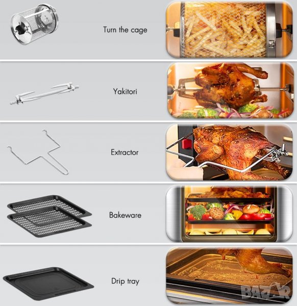 [Перфектен дизайн]: 1. Вградено осветление, което може да се включва или изключва, за да се улесни по-доброто наблюдение на състоянието на готвене на храната. 2. Обратното броене ще се затвори автоматично и ще има напомняне, когато е на път да приключи. 3. Подвижна двуслойна топлоустойчива врата от закалено стъкло може да задържи цялата топлина вътре в устройството по време на готвене.