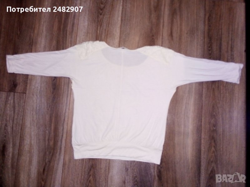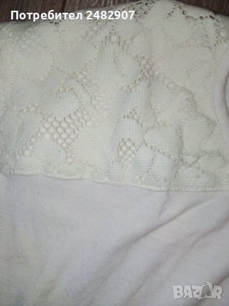 Бяла блузка за момиче с дълъг ръкав и дантела на раменете. Ръст - до 164 см. Ширина в раменете - 48 см, ширина под мишниците - 50 см, дължина от рамото до долу - 54 см, дължина на ръкава от рамото - 33 см, ширина в долната част на блузката - 39 см, ширина на ръкава в долната част - 8 см. Много запазена, почти не е използвана.