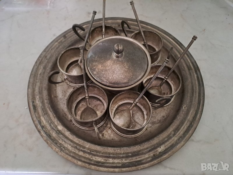 Старинен поднос със стаканчета за чаши, лъжички и захарница → Обява 39673918