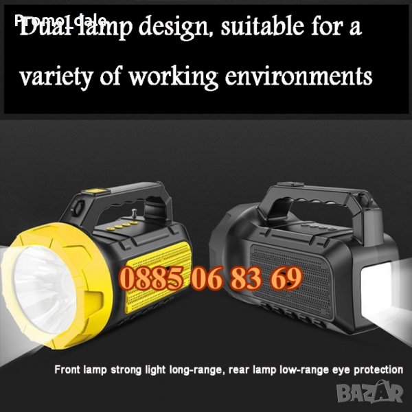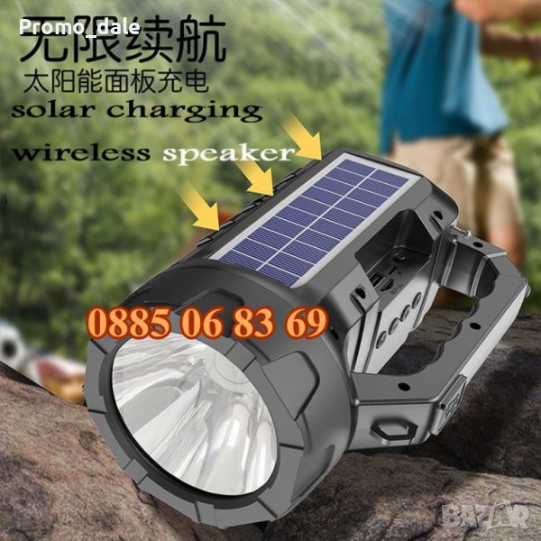 Мощен високоговорител, интегрирано FM радио, включително слънчево зареждане, фенерче, MP3. Обхват на осветление до 500 метра, 5W Bluetooth високоговорител, 1200mAh акумулаторна литиева батерия.