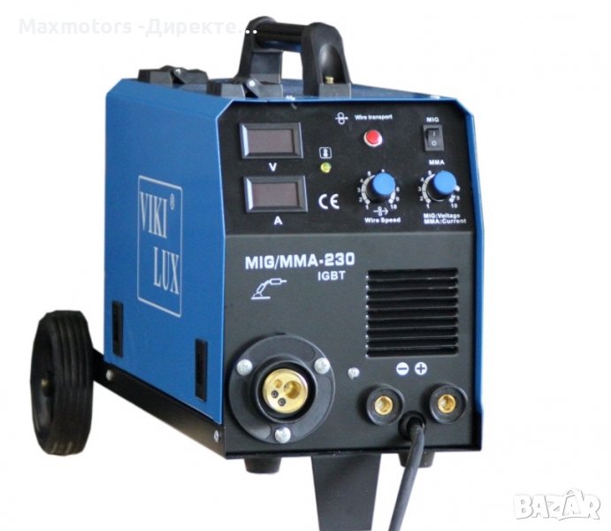 телоподаващо устройство MIG/MMA 230А VIKI LUX с електрожен, за монофазен ток. Висок клас технология. Регулиране на заваръчния ток/плавно/ 20-230A ампера, монофазен /230V/. Степен на защита - IP 21S. Работи с ролки от 1 и 5 кг. Окомплектовани са с еврошланг за МИГ/МАГ заваряване, щипка маса, маска, чукче с четка, оригинални ръкавици за заваряване от телешка кожа. Предназначен е за ремонтни и сервизни дейности. Поради широкия спектър на заваряване с HITECH ТЕХНОЛОГИЯ, заварява почти всички видове метал и е удобен за монтажни заварки от професионалисти и начинаещи заварчици. По желание на клиента, телоподаващо MIG/MMA 230 А VIKI LUX, може да се окомплектова с манометър и малка бутилка СО2 3-6.7 литра.
