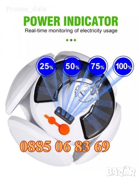 Мобилно осветление подходящо за къмпинг - Туристическа лед лампа-фенер соларна, зарежда се от слънцето, с вграден акумулатор, удобна за къмпинг, риболов и др.