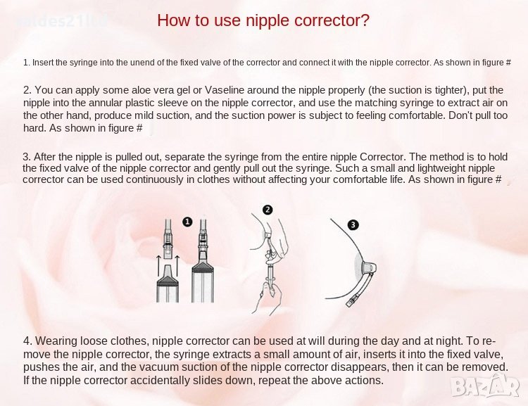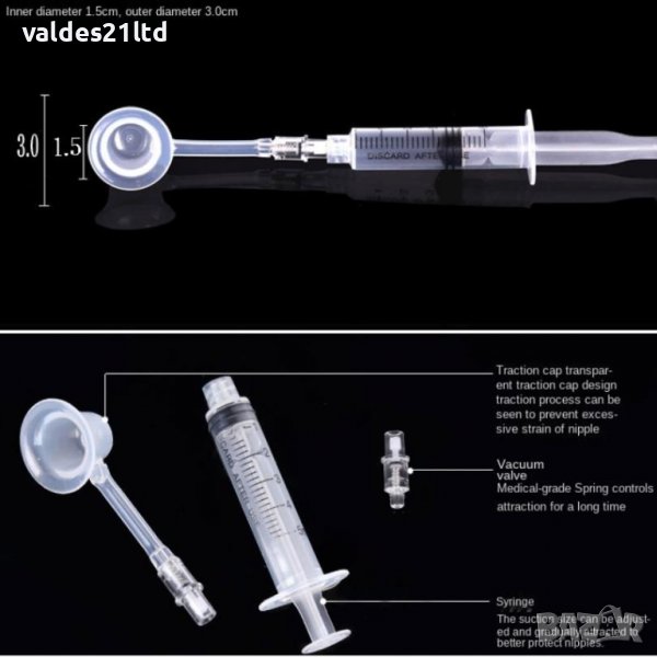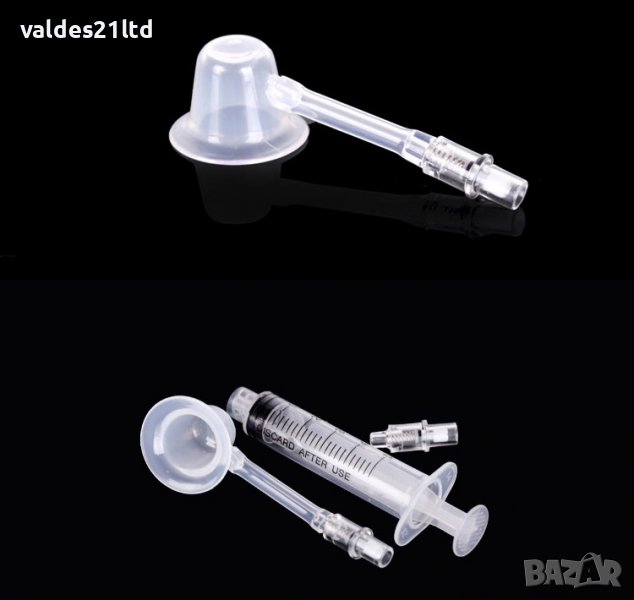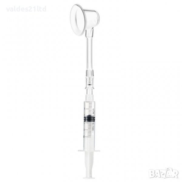 2. Поставете коректора вурху зърното и изтеглете въздуха със спринцовката. Ако желаете може да повторите това още веднъж или два пъти. За да направите това, трябва да откачите спринцовката от коректора, да върнете буталото в начална позиция и отново да свържете спринцовката с коректора и да изтеглите въздуха отново. Клапата няма да позволи нахлуването на въздух. Вакуума е по- силен ако намежете зоната около зърното с вазелин.