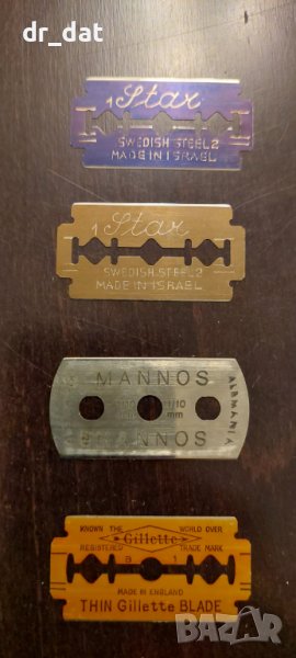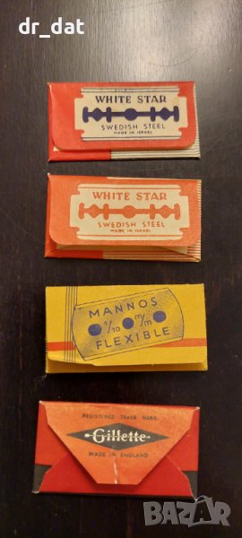 Стари двустранни ножчета. Изглеждат неизползвани. Единично опаковани с отлично запазени за възрастта им опаковки, които също са колекционерски. Не съм сигурен от коя година са, но тези модели са ползвани около средата на миналия век. Двете са израелски, но правени със шведска стомана, третото е вероятно произведено от или за Солинген, а Жилета е много популярно, като първите са от 30-те години, но тези специално са по-нови - вероятно от 50-60-те години. Цената от 5 лева е за целия лот от четирите. Поотделно се продават по 1 евро, като ножчето на Жилет е 2 евро. Имам по няколко от всеки модел.