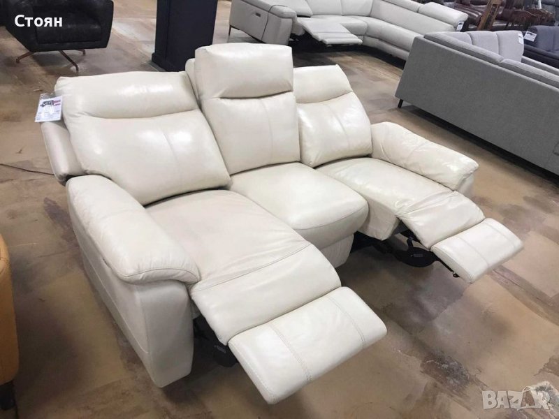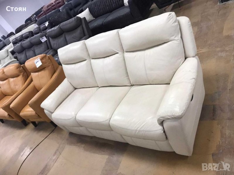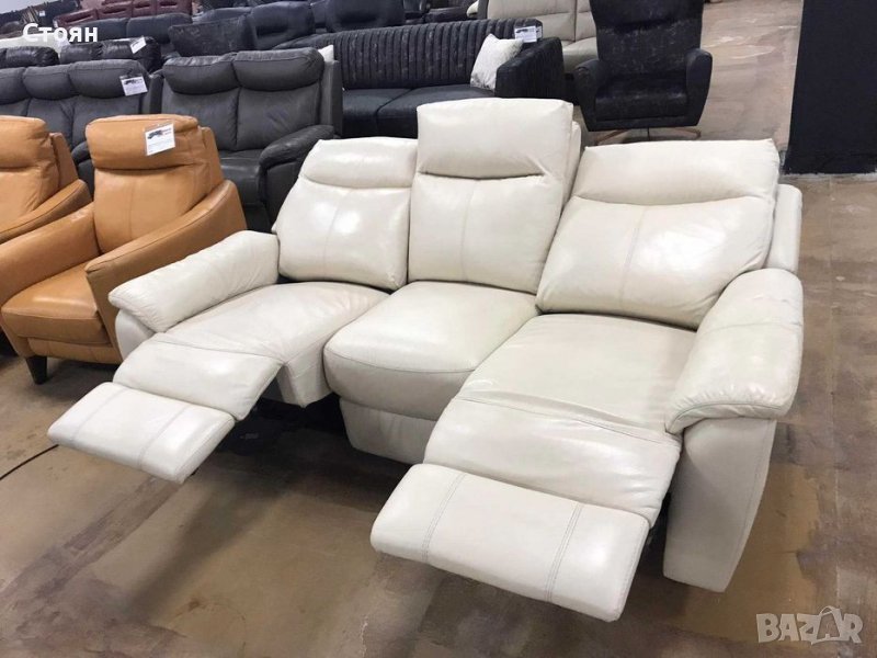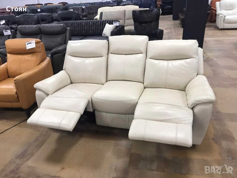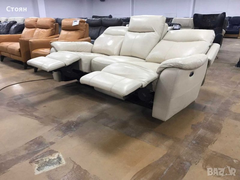 Кремав диван тройка-естествена кожа с релаксиращ механизъм за краката