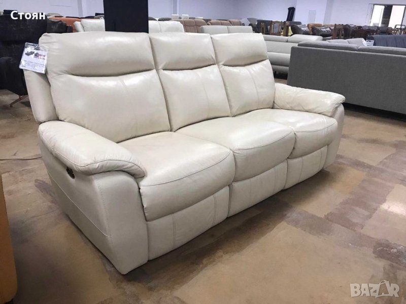 Кремав диван тройка -естествена кожа с електрически релаксиращ механизъм за краката в отлично състояние.