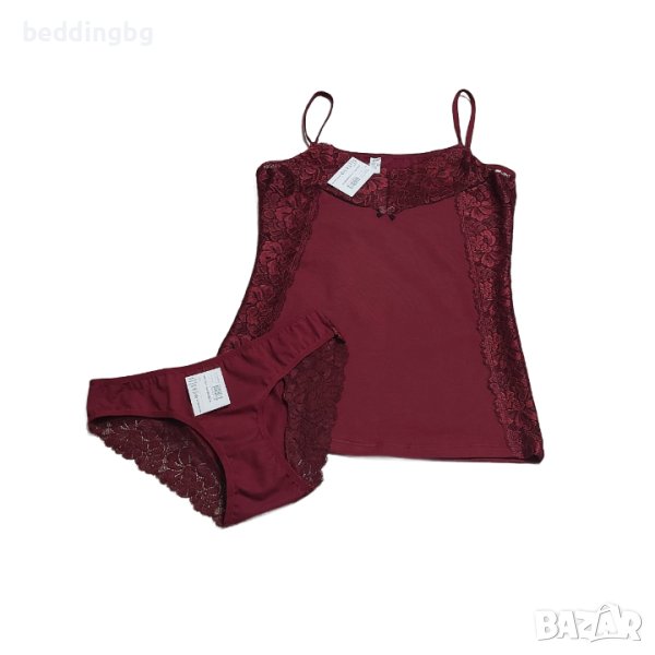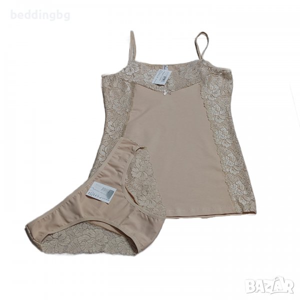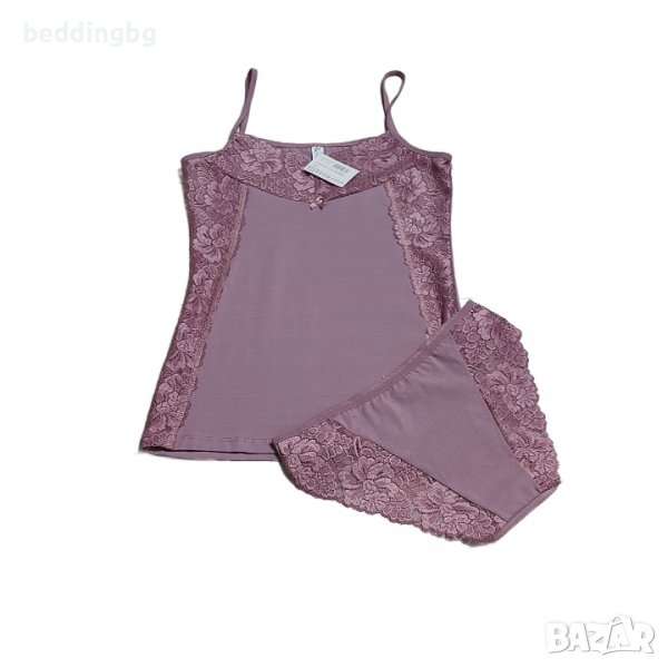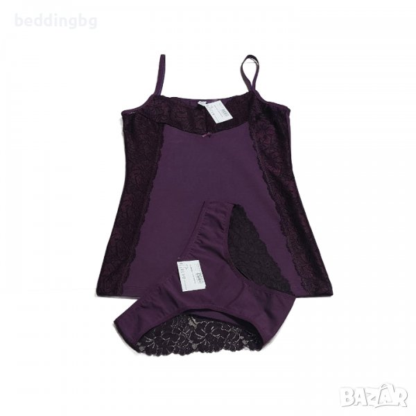 Дамски дизайнерски комплект в различни цветове. Състои се от две части - корсаж с тънка презрамка, леко втален и богато декориран с мека еластична дантела в горната и страничната част. Бикините са със стандартна талия, украсени с дантела. Комплектът е изработен от нежна памучна материя, която придава пълен комфорт.