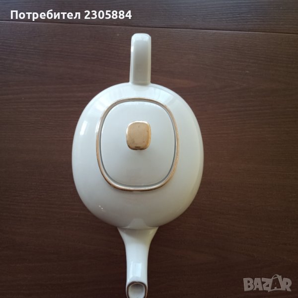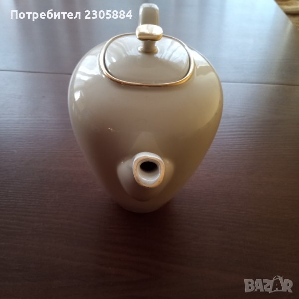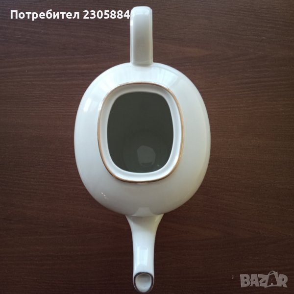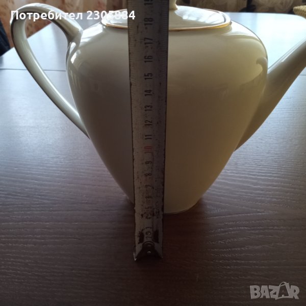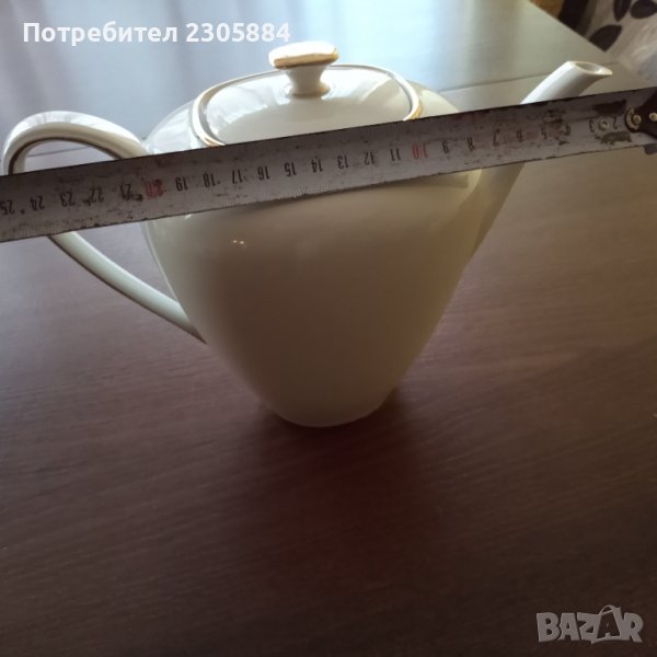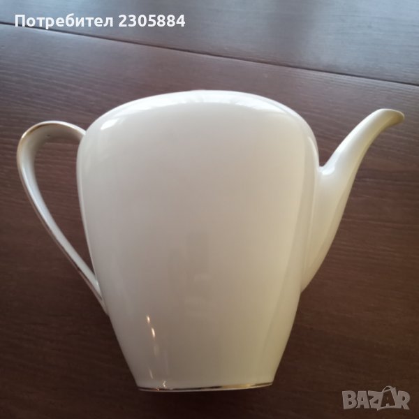 Бяла кана от Германия Bavaria Eschenbach. Размери височина 18см ширина с дръжката 24 см. Вместимост 1литър. Бяла изчистена със златисти обкантвания. Без забележки по каната. Минимални забележки по капачето видими на снимките. Не пречат за пълноценното използване на каната