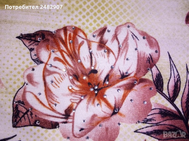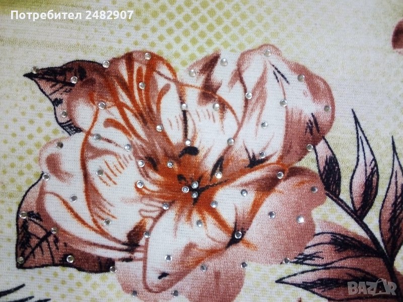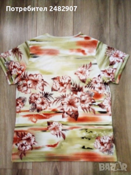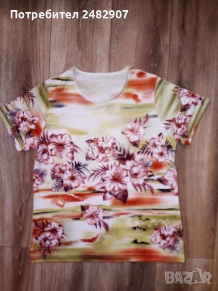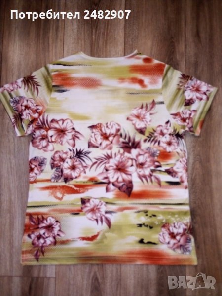 Дамска блуза с къс ръкав, флорални мотиви и малки цепки отстрани в долната част, размер L. Ширина в раменете - 38 см, ширина под мишниците - 52 см, дължина от рамото до долу - 66 см, дължина на ръкава от рамото - 19 см. Много запазена, почти не е използвана.