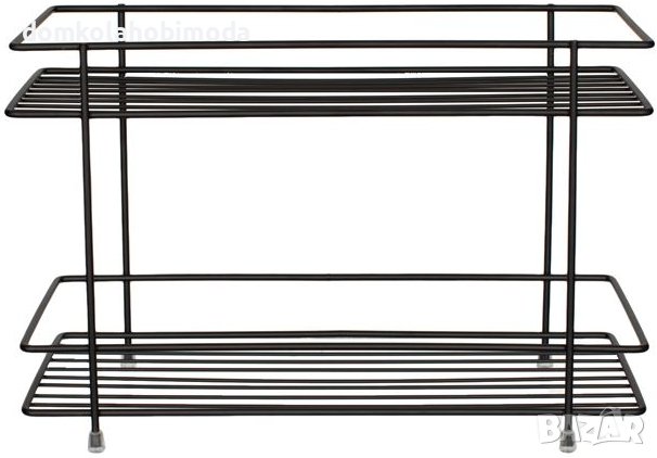 Рафт на 2 нива, черен металик. Има силиконови тапи на краката, за да не се хлъзгат. Удобно побира пакети с подправки или контейнери за храна, козметика и др. Рафтовете са с дълбочина 4 см. Те организират предмети, така че да ги намирате лесно и могат да бъдат поставени в кухнята, банята или друга част на къщата.