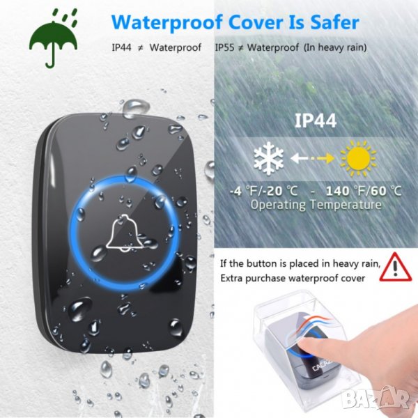 Батерии и допълнителна защита: Комплектът не включва батерии. Типично за бутона се използват 2x AAA батерии, а за звънеца – 3x AA (или по-големи за по-дълъг живот). Препоръчително е да използвате алкални батерии за по-дълъг живот. Ако бутонът ще бъде изложен на много сурови условия (силен слънчоглед, градушки), можете да закупите допълнителна пластмасова капачка (както е посочено в описанието), която ще осигури допълнителна защита.