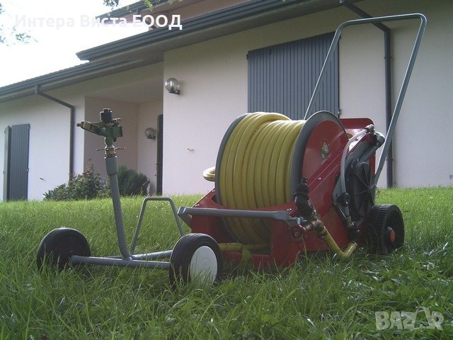Поливна макара – диаметър 20 мм, дължина 40 м, турбина, комплект с количка, секторен разпръсквач с накрайник /мундщук/, регулируема плътност и скорост на пръскане, автоматично спиране и затваряне на водната струя след спиране на работа, тегло: 35 кг, свързващ маркуч 5 м