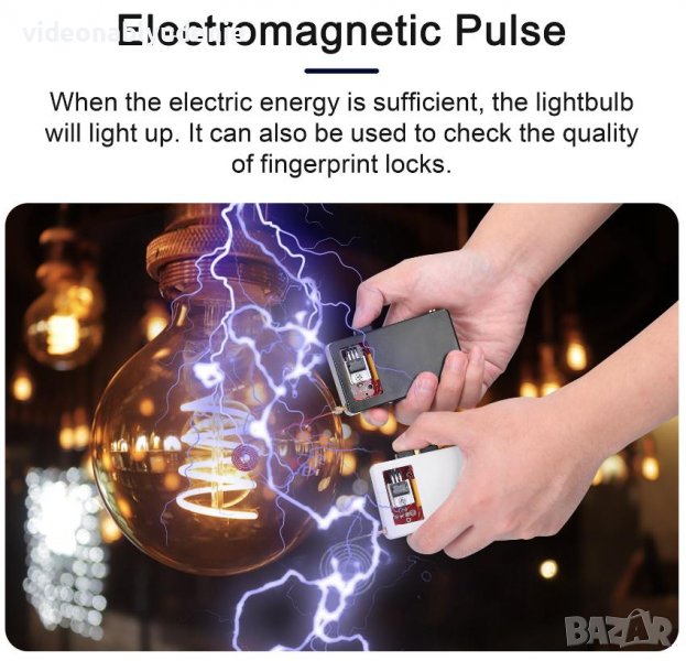 Генератор на електромагнитен импулс, който създава високочестотно електромагнитно вълново поле. Енергоспестяващите лампи около генератора, предизвикват електромагнитни вълни и генерират електричество, без да са свързани с фасунга в ток. Тествайте по този начин продукта, като поставите крушка до него и тя ще светне. Има две антени, бутон за работа, превключвател ОN 1 - 2 и индикатор за зареждане. Червената светлина изключва, когато приключи зареждането. Устройството работи с еднократно натискане (едно кликване). Не може да работи непрекъснато. Не докосвайте металната част на предавателя по време на действие, за да не изгорите ръцете си.