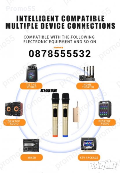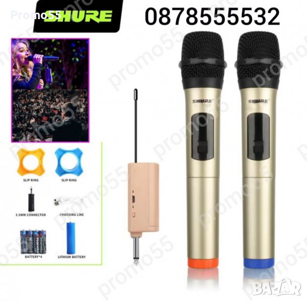 Използват се за професионална работа, за говорене, пеене, запис на различни събития и караоке. Страхотно решение за училища, тържества, сватби, клубовеи други. Микрофоните работят с две АА батерии и имат дисплеи. Предлагат се в картонена кутия. Микрофоните могат да работят заедно и поотделно, в смесен режим. Основа за микрофон с 6,25 мм изход и акумулаторна батерия.
