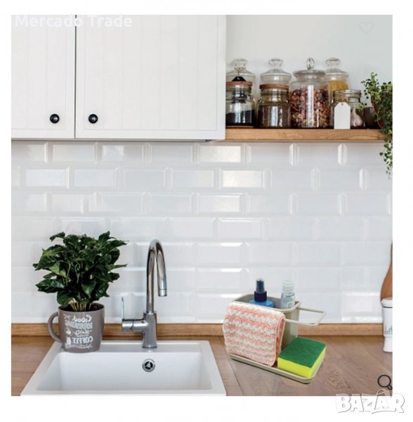 Органайзер за мивка с отделение (13x6.5x13cm) за поставяне на препарат за миене на съдове, гъбена повърхност с отвори за оттичане на водата и джоб за закачане на гъба или кърпа.
