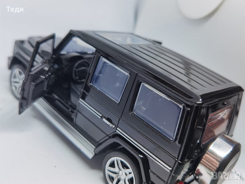 Макет 1:32 на Mercedes G Class вратите се отварят и багажника също и предния капак също , слагат се батерии и колата свети при отваряне на врата издава звуков сигнал и като се натисне отгоре пак се чува двигателя и звук като даване на газ.