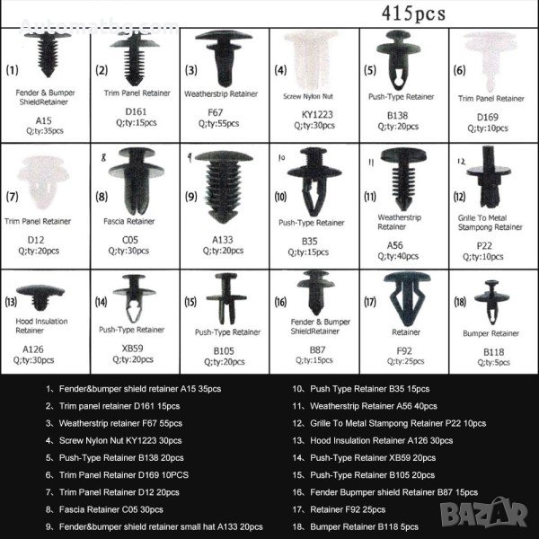 Комплект 415 бр. щипки от показаните на снимката модели.