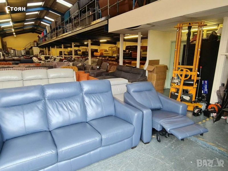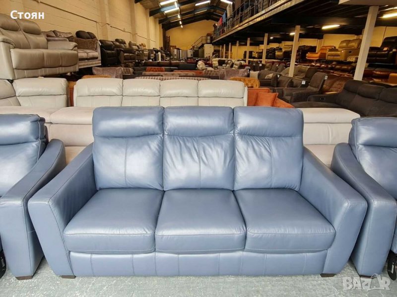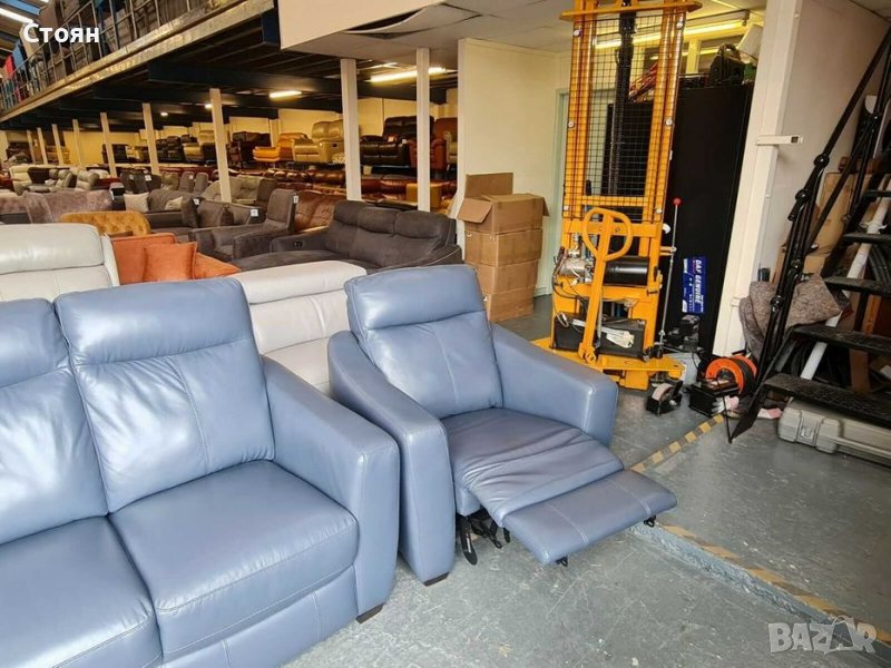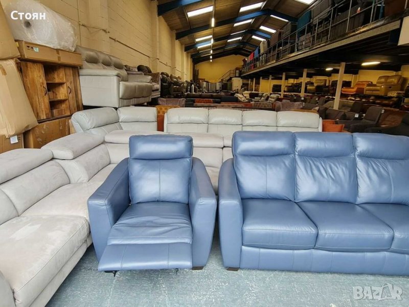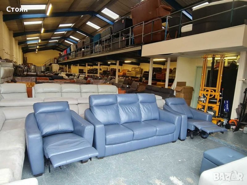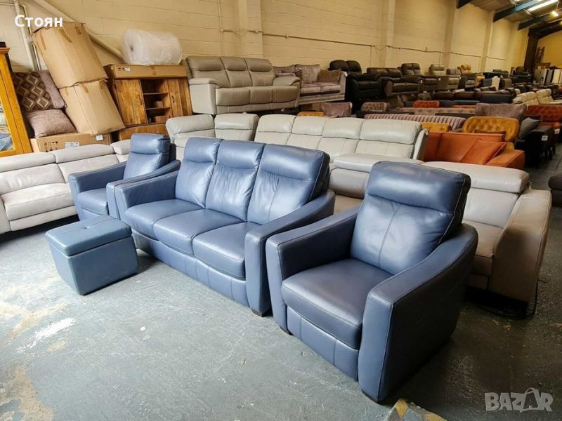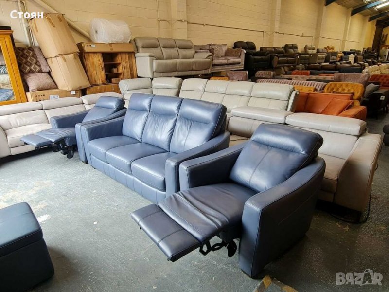Син кожен диван тройка, два фотьойла и табуретка - естествена кожа в отлично състочние. Двата фотьойла са с електрически релаксиращ механизъм за краката, който се управлява с бутони. Табуретката е тип ракла.
