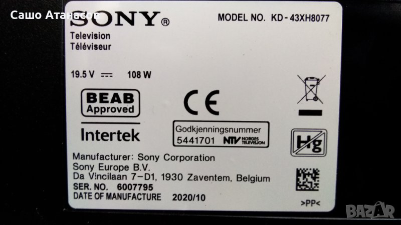 SONY KD-43XH8077 със счупена матрица ,1-002-850-31 ,1-004-240-11 ,6870C-0814A ,DHUR-SY63 ,ADP-120CR